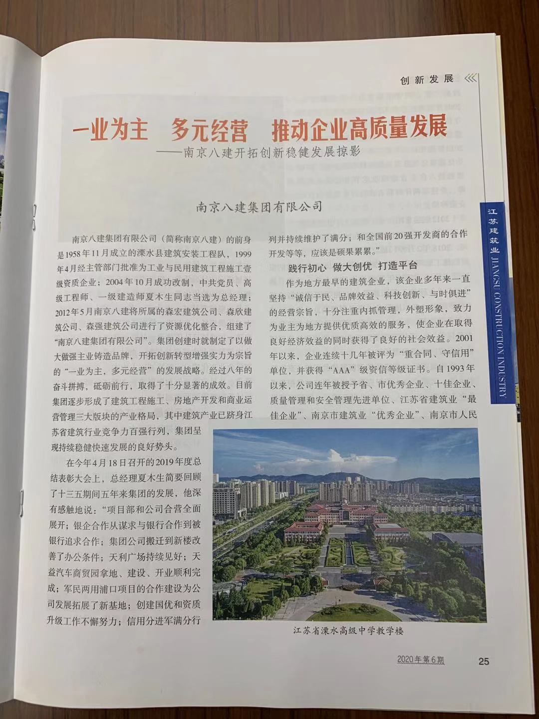 《一業(yè)為主 多元經(jīng)營 推動企業(yè)高質量發(fā)展》發(fā)表在2020年6月《江蘇建筑業(yè)》雜志上。 -