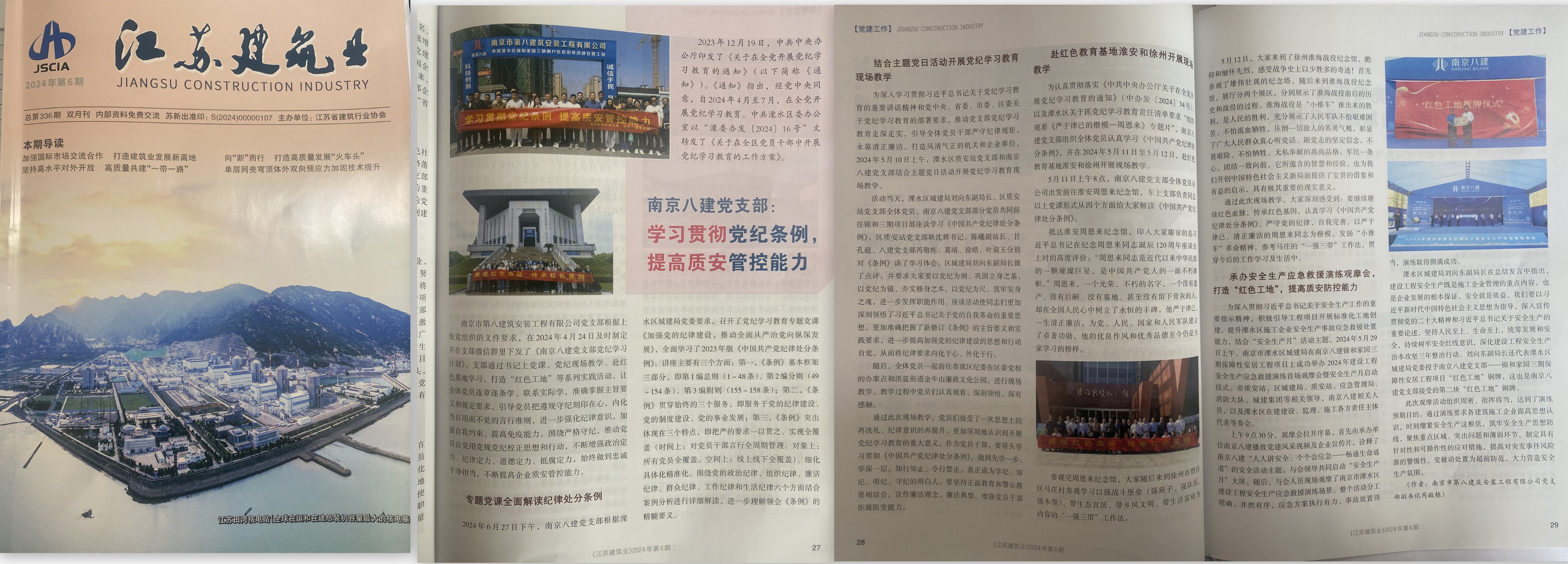 2024年6月,江蘇建筑業(yè)協(xié)會主辦的《江蘇建筑業(yè)》(2024年第6期)刊登了芮敬棟同志《南京八建黨支部:學習貫徹黨紀條例,提高質安管控能力》一文 -